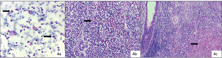 Figure 4. Cat 2: Cytosmears (a): Showed only lymphocytes and reactive lymphoid cells and reported as intra-parotid reactive lymph node (Diff Quik, 400×) (Category II), histopathology (b and c): Confirmed as KD (H&E, 200×) (arrow pointing eosinophils in cytology and histology slides).
