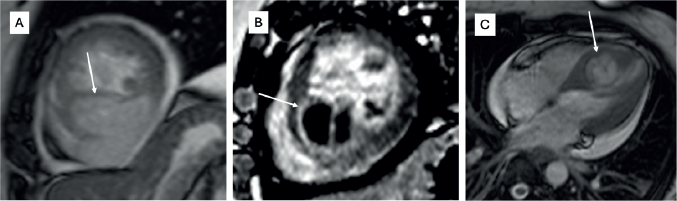 Figure 1. Cardiac MRI of a patient with synovial sarcoma of interventricular septum – (a): Bright blood (SSFP sequence) in short-axis view showing the heterogeneously hyperintense mass lesion (arrow) involving the septum and extending into the inferior wall of the left ventricle; (b): Late gadolinium enhancement (LGE) sequence in short axis view showing heterogenous peripheral enhancement with central non-enhancing component; (c): Bright blood (SSFP sequence) in four chamber view showing the mass (arrow) with cystic appearance within it.
