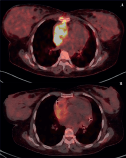 Figure 4. PET scans of a patient with locally advanced/unresectable cardiac angiosarcoma (a): Before chemotherapy and (b): After 5 cycles of single-agent gemcitabine.