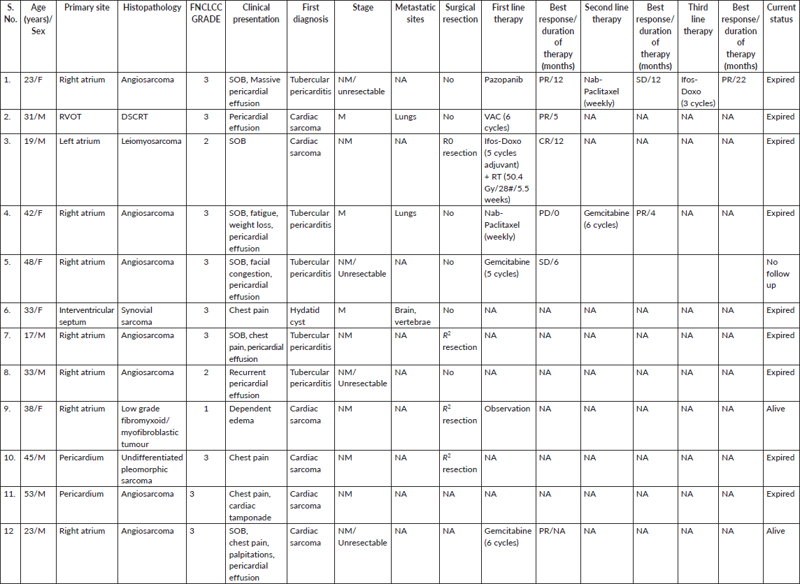 Results: A total of 12 patients were identified with primary cardiac sarcoma, with a median age at diagnosis of 33 years (IQR 20.5; range: 17–53). At presentation, 66.7% had pericardial effusion requiring pericardiocentesis with or without pleuropericardial window. Half (6 of 12 patients) were misdiagnosed initially as either tubercular pericardial effusion or cardiac hydatid cyst. Upfront resection was done for 4 patients (33.3%), while 4 (33.3%) had locally advanced/unresectable disease and the remaining 4 (33.3%) presented with de-novo metastatic disease. Angiosarcoma constituted 50% (6 out of 12), all arising from the right atrium. Of the 12 patients included, 6 received a median two lines of therapy. Of the total 9 response assessments (both as first line and subsequent lines), 55.5% had an objective response rate with an 88.8% clinical benefit rate. The median progression-free survival for first-line systemic therapy was 5.4 months. The median overall survival for patients who received systemic therapy and the entire cohort were 19.2 and 5.1 months, respectively.