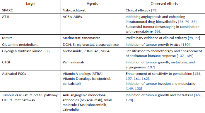 Table 3. Various stromal components in PDAC, agents that target them and observed effects of targeting them.