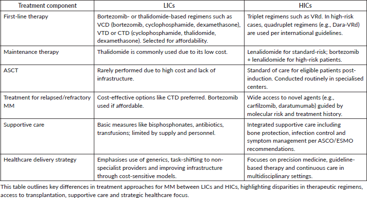 Table 1. Comparative summary of MM treatment strategies in LICs and HICs.