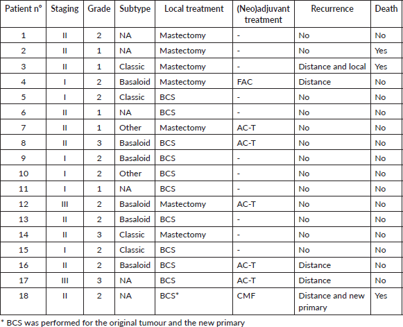 Most patients (n =18–85,7%) included in the study had initial localised or locally advanced disease (stages I–III). Treatment patterns are detailed in Table 2. Four patients underwent neoadjuvant systemic chemotherapy, all with anthracycline and taxane-based regimens. Clinical response was identified in three patients (75%), while the other had stable disease. No progressive disease was observed during neoadjuvant therapy. Among these four patients, two underwent mastectomy and two underwent conservative surgery. All of them had residual disease in the surgical specimen. Among the 14 patients treated with upfront surgery, only three received adjuvant systemic therapy: two with an anthracycline-based regimen and one with cyclophosphamide, methotrexate and fluorouracil (CMF).
