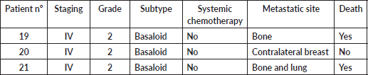 Three patients (14.2%) presented with metastatic disease at diagnosis. None was treated with chemotherapy. Two of them died after 3.8 and 8.1 months, while the third was lost to follow-up. The most frequent sites among all metastatic patients were bone (50%), liver (25%) and lung (25%). Contralateral breast, central nervous system, peritoneum and non-regional lymph node metastasis were found in one patient each (Supplementary Table 2).