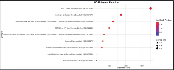 The MF analysis identified MHC Class II receptor activity as the most enriched term, with the highest combined score and overlap ratio. This was followed by ionotropic glutamate receptor activity and neurotransmitter receptor activity involved in the regulation of postsynaptic membrane potential, indicating functional links to both immune recognition and neuronal signaling. Other enriched terms included MHC Class II protein complex binding and transmitter-gated monoatomic ion channel activity involved in the regulation of postsynaptic membrane potential, further highlighting the interplay between antigen presentation and synaptic signaling. Lower combined score functions, such as sodium channel activity, ligand-gated monoatomic cation channel activity and potassium channel activity, point toward additional ion transport processes. The dataset is enriched for functions related to MHC Class II-mediated antigen recognition and binding, with secondary enrichment in neurotransmitter receptor activity and ion channel regulation (Figure 3).