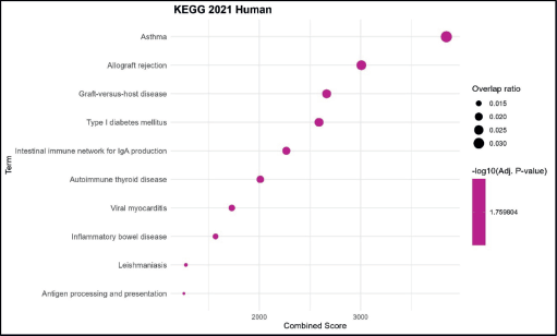 KEGG pathway analysis revealed significant enrichment in immune-related diseases, with the highest combined score observed for asthma, followed by allograft rejection and graft-versus-host disease. Other notable enriched pathways included type I diabetes mellitus, intestinal immune network for IgA production and autoimmune thyroid disease, highlighting strong associations with autoimmune and hypersensitivity conditions. Lower-ranked enriched terms comprised viral myocarditis, inflammatory bowel disease, leishmaniasis and antigen processing and presentation, indicating a broader involvement of the dataset in infectious and inflammatory immune pathways. The dataset shows predominant enrichment for KEGG pathways related to autoimmune, inflammatory and immune-mediated diseases, suggesting a central role in immune dysregulation and pathogen response (Figure 4).