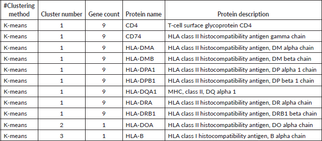 Table 3. K-means clustering of proteins based on expression or interaction profiles. Proteins were grouped into clusters using the K-means method. Each entry lists the clustering method, assigned cluster number, number of genes in the cluster, protein name and full protein description. Cluster 1 contains nine proteins, predominantly HLA class II molecules, while clusters 2 and 3 each contain a single protein.