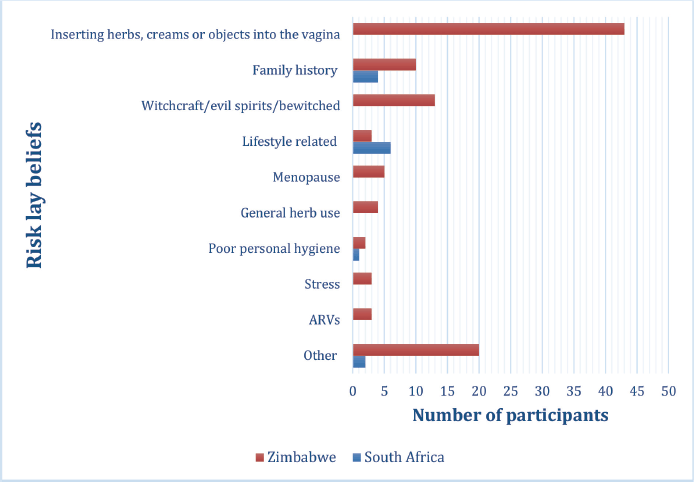 Overall, 90 (18%) women mentioned at least one lay belief about risk factors for cervical cancer (Table S2), with most reported by women from Zimbabwe (Figure 1). The most reported risk lay belief, inserting herbs, creams or objects into the vagina (9%, n = 43), was only reported by women from Zimbabwe (Table S4).