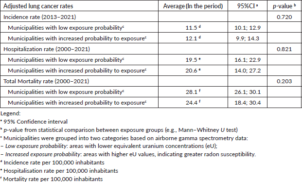 Average coefficients and their corresponding 95% confidence intervals were calculated for each lung cancer outcome (incidence, hospitalisation and mortality) over each time period, stratified by radon exposure probability. To assess differences in average rates between municipalities based on radon exposure, Student t-tests were conducted with a statistical significance level of p < 0.05.