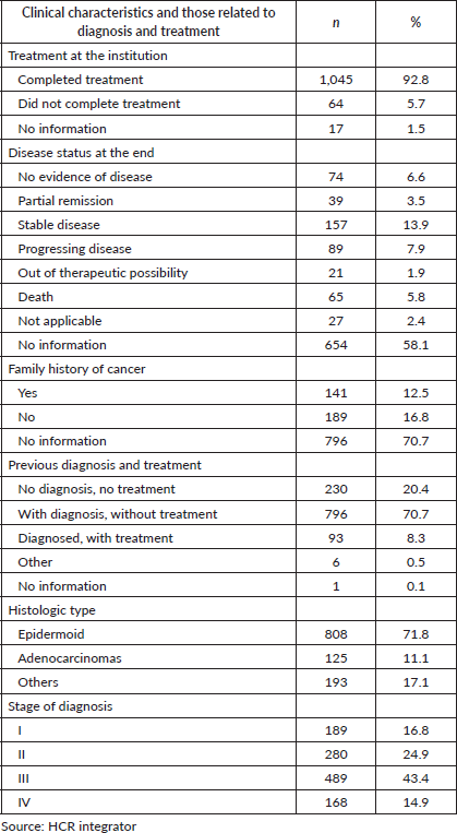 Regarding clinical characteristics and those related to the diagnosis and treatment of women diagnosed with CC, 92.8% of the women completed the initial treatment proposed and 13.9% had stable disease at the end of it, although this variable contained 58.1% of the observations with no information. Most of the women (79.0%) arrived at the referral institution with a firm diagnosis (Table 2).