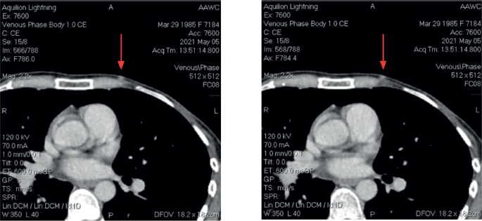 After the second postoperative cycle, the patient palpated three new subcutaneous nodules on the left chest wall, confirmed by CT scan (Figure 2). No distant metastases were identified. A fourth surgery focused on the removal of subcutaneous lesions. Postoperative pathology confirmed breast cancer in all three specimens. The tumour board recommended postoperative radiotherapy (RT) and hormonal therapy with AI ± CDK4/6 inhibitors. The patients went abroad to Germany, where new left axillary lymphadenopathy was found. The patient had another surgery: left axillary lymph node dissection. Afterward, she received RT combined with Capecitabine and two cycles of Capecitabine after RT. However, follow up with a CT scan revealed recurrence with new lesions in the liver. Treatment was adjusted to Ribociclib plus Fulvestrant, which she received for 5 months without a major response.