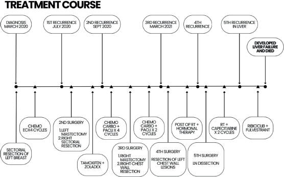 This case report presents the clinical course of a 35-year-old female diagnosed with breast cancer. Despite initial treatment modalities, the patient experienced recurrence, leading to a series of surgeries and multiple lines of chemotherapy. The case highlights the challenges in managing recurrent breast cancer.