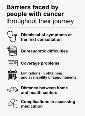 The results obtained reveal that people with cancer would face significant barriers throughout their journey with the disease. Among the most frequent are the dismissal of symptoms during the first consultation, bureaucratic difficulties, coverage problems, limitations in obtaining and availability of appointments, the distance between home and health centers and complications in accessing medication. This last obstacle, in particular, causes a delay in the start of treatment: people who face problems obtaining medication begin their treatment, on average, 41 days later than those who would not experience this difficulty. Furthermore, the analysis shows that those who would experience bureaucratic barriers (especially problems related to authorisations) begin their treatment 57 days later than the average. The findings show that barriers to accessing cancer care during the early stages (first consultation, diagnosis and treatment) are closely linked to bureaucratic, coverage and geographic factors.