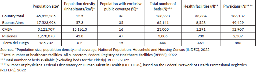 In this article, as explained in the following section, we will work with four jurisdictions: the CABA and the provinces of Buenos Aires, Misiones and Tierra del Fuego. As shown in Table 1, the selected jurisdictions have markedly dissimilar characteristics, both in socioeconomic terms and in the organisation and capacity of their health systems.
