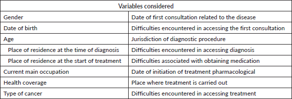The main data collection technique was an ad hoc questionnaire consisting mainly of closed or semi-closed questions, although some open questions were included. The questionnaire addressed the following dimensions: a) Sociodemographic characteristics of the patient, b) Start of the cancer patient's journey, c) Diagnosis, d) Medication and treatment and e) Support during the patient's journey. It consisted of 56 questions.