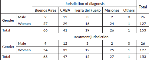 Table 3. Characteristics of the sample. Gender and jurisdiction of diagnosis and treatment of participants.