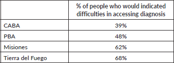 The questionnaire asked about the type of difficulties encountered in relation to access to diagnosis. Among the list of possible answers, only four were selected by those who encountered obstacles: bureaucratic or coverage difficulties (24%), difficulties in getting appointments (22%), appointments given with long delays (21%) and distance from home to health facilities (18%). The rest of the options reached percentages of less than 10%.