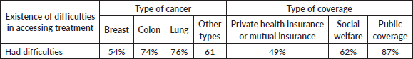 Among the obstacles encountered, some appeared more frequently in certain groups of patients. For example, in the case of people with colon cancer, 50% mentioned having difficulties related to appointments (difficulty in obtaining them or long delays) and 25% of people with lung cancer indicated difficulties in reaching a diagnosis (for example, their lesions were difficult to biopsy). Bureaucratic difficulties reached higher percentages among those diagnosed in Misiones (44%) and Tierra del Fuego (31%).