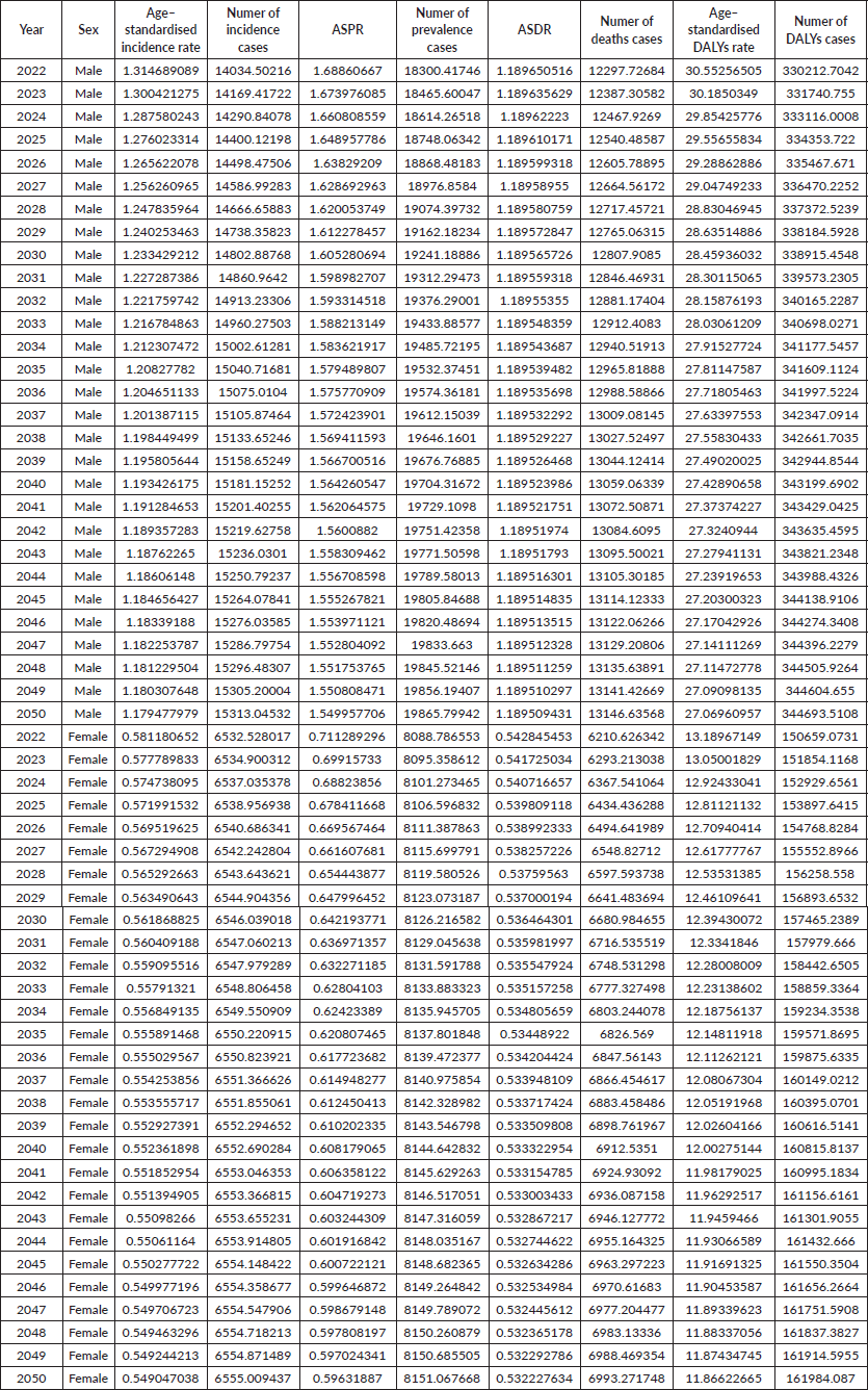 Figure 7. The predicted results in the A-LC-related numbers and age-standardised rates of ASIR, ASPR, ASDR and ASR of DALYs by sex in China from 2022 to 2050 of the ARIMA model.