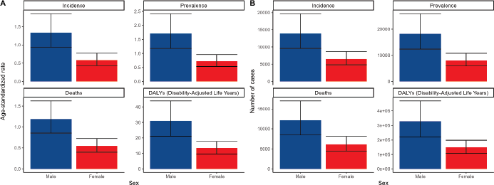 Figure 2. Shows the comparison of ASRs and number associated with incidence, prevalence, death and DALYs of A-LC patients of different genders in China in 2021.