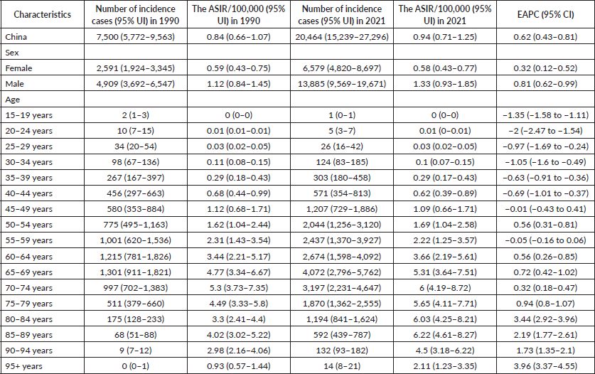 Table 1. The number of incidence cases and the ASIR attributable to A-LC in 1990 and 2021, and its trends from 1990 to 2021 in China.