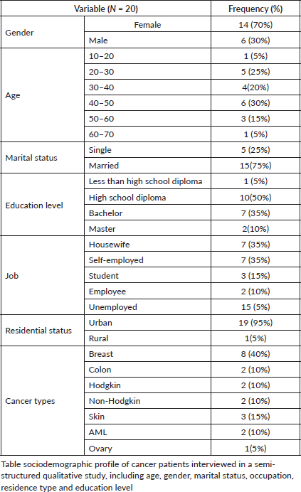 In the present study, 20 participants took part in the semi-structured interviews. The average interview length was 25 minutes. Table 1 presents the demographic and clinical characteristics of the participants. As shown in Table 1, the majority of the patients (n = 14, 70%) were female, and the most common age group was 40–50 years (n = 6, 30%). In terms of marital status, 15 participants (75%) were married. Regarding education level, the largest group (n = 10, 50%) had a high school diploma. The participants primarily resided in urban areas (n = 19, 95%). The cancer types varied among the participants, with the majority having breast cancer (n = 8, 40%). Other cancer types included colon (n = 2), Hodgkin (n = 2), non-Hodgkin (n = 2), skin (n = 3), AML (n = 2) and ovary (n = 1). The key findings are summarised in Table 1.