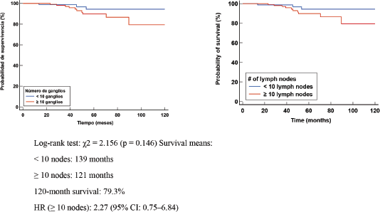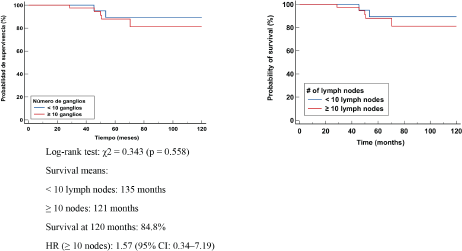 In the analysis of mortality and recurrence as a function of the number of nodes removed, it was identified that the mortality rate was higher in patients with ≥10 resected nodes, with 12 (5.6%) deaths compared to 5 (2.8%) in the group with <10 nodes, although the difference was not statistically significant (p = 0.186). The proportion of relapses (local, regional and/or distant) was similar in the two groups; in the <10 nodes group, it was 17.6% with 13.6% distant relapses, while in the ≥10 group 16.7% relapses, of which 13.5% included distant relapses with no statistical association (p = 0.820)