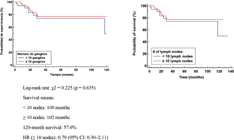 Kaplan-Meier OS curve analysis evaluated the number of salvaged LGs. The log-rank test yielded a c2 = 1.765 (p = 0.184). Clinical interpretation of the results indicates that there was no statistical association in OS in patients with BC who received NCT to whom DA < or ≥ 10 LN was performed. Patients with ≥10 LN had a longer median survival compared to the group of patients <10 LN, with no statistical association and both groups with a 120-month survival probability of 96.2%. The HR for patients with ≥10 nodes removed was 1.91 (95% CI: 0.73–4.98) Figure 1.