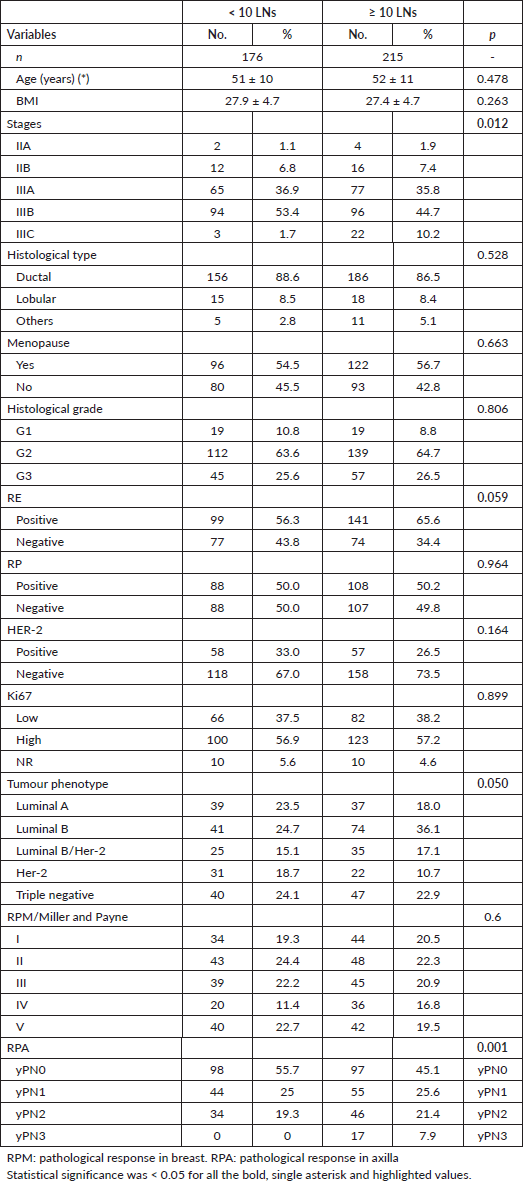 Thirty-nine hundred and ninety-one patients met the inclusion criteria. The mean age at disease diagnosis was 51 years ± 11 (ranging from 25 to 87 years), 176 patients in the <10 LN group and 215 ≥ 10 dissected nodes. The average number of dissected LGs was 6.32 and 13.8 in the groups and the proportion of positive LGs 0.23 and 0.20< or ≥ 10 LGs, respectively. The rate of PCR 19.3%, PCR in the breast (CPRR) 22.7% and axillary pathological response (APR) 55.7% when <10 LN were retrieved, when dissected or retrieved ≥10 LN the found rates of PCR, CPRR and APR reported 16.3%, 19.5% and 45.1%, respectively.