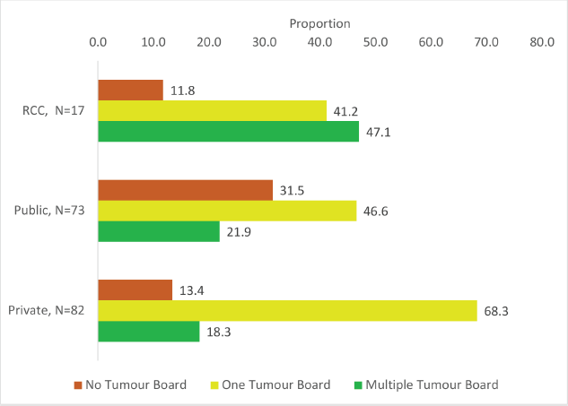 The distribution of the proportion of hospitals with and without tumour board by type of health facility is provided in Supplementary Figure 1.