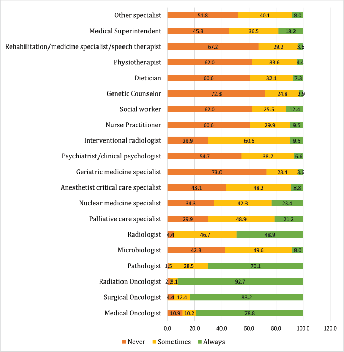 Supplementary Figure 3 reflects the number of professionals who typically took part in tumour board meetings. The three most highly participating specialists were Radiation Oncologists (92.7%), Surgical Oncologists (83.2%) and Medical Oncologists (78.8%). Other specialists, including Pathologists (28.5%), Radiologists (46.7%) and Palliative Care Specialists (48.9%) rarely participated. However, specialists such as Microbiologists (42.3%), Geriatric Medicine Specialists (73.0%) and Rehabilitation Medicine specialist (67.2%) had exceptionally low participation.