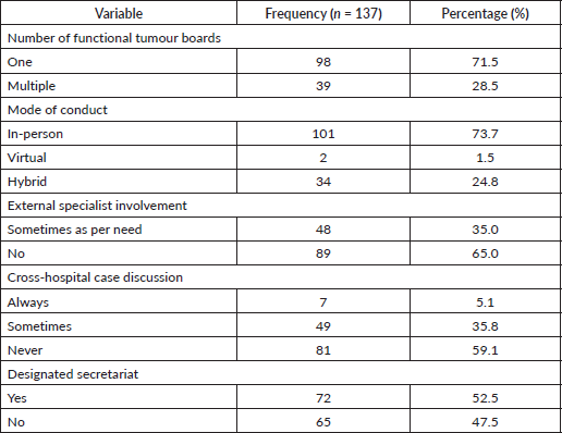 Result: Of 229 hospitals, only 172 (75%) responded. Among them, 137 (79.7%) reported having a functional tumour board. Most of the tumour boards were established in tertiary care centres (45.3%) and medical colleges (43.6%). In-person meeting (73.7%) was the most common with 24.8% following a hybrid model. Only 5.1% of hospitals engaged in cross-hospital case discussions; 16.8% maintained electronic medical record notes; and 48.2% lacked any follow-up mechanisms to track tumour board recommendations and outcomes. Involvement of palliative care specialists and other supportive paramedical health professionals was low. In addition to that, thematic analysis also identified that there was inadequate documentation, inconsistent follow-up and limited tumour board participation.