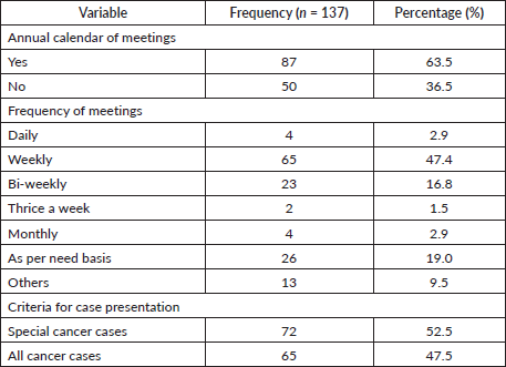 Table 2 describes the operational procedures of tumour board. The frequency of Tumour Board meetings varied across hospitals: 47.4% (n = 65) met weekly, 16.8% (n = 23) bi-weekly, 2.9% (n = 4) monthly and 2.9% (n = 4) daily. Notably, 19.0% (n = 26) met on an as-needed basis, while others followed irregular schedules (9.5%, n = 13). An annual calendar for meetings was maintained by 63.5% (n = 87) of tumour boards.