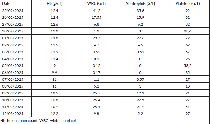 Stem-cell mobilisation was achieved with filgrastim 10 µg/kg/day for seven days. Pre-collection blood count showed haemoglobin at 13.3 g/dL, marked hyperleukocytosis at 65.8 G/L with neutrophil predominance (52.16 G/L) and platelets at 187 G/L. A collection volume of 207 mL was obtained, with graft quantification showing 2.8 × 10⁶ CD34⁺ cells/kg. The CD34 stem cells counts was perfomed in the laboratory of Dalal Jamm Hospital by flow cytometry. The graft was stored without cryopreservation at 4°C for 24 hours then reinfused after conditioning with melphalan 140 mg/m2 IV on day −1. Reinfusion took place on 26 February 2025 (day 0) in a positive-pressure single room.