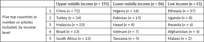 Of the 345 selected studies, 191 (55%) articles were conducted in upper-middle income countries, 86 (25%) in LMICs and 61 (18%) in low-income countries (six studies were implemented in several countries with varying income levels). The countries with the most studies included were China (n = 72), Ethiopia (n = 37), Turkey (n = 24), Malaysia (n = 23) and Nigeria (n = 16). Table 3 shows the five countries of each income level group with more articles included, and the number of articles from each.