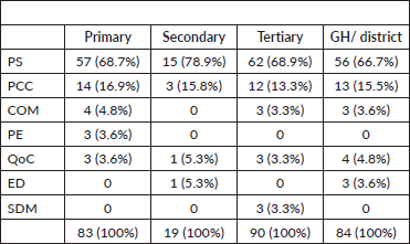 PS was the most frequently analysed domain across all healthcare levels, followed by PCC. Quality of care (QoC) was assessed across all levels, with the highest proportion observed at the secondary care level (5.3%), while education (ED) was reported in both secondary (5.3%) and GH/District levels (3.6%), but not in other levels. As expected, SDM was primarily reported at the tertiary care level (3.3%), where more specialized and complex care decisions are typically made.