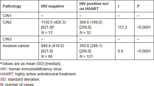 Table 5. Statistical significance of the difference in mean CD4 T-cell count/μL of preinvasive and invasive lesions on HAART and not on HAART