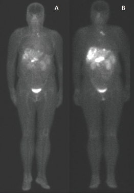 Figure 1. 99mTc-EDDA/HYNIC-TOC compared to 111In-DTPA-octreotide. Example of scintigraphy examination using (a): 111In-DTPA-octreotide and (b): 99mTc-EDDA/HYNIC-TOC in the same patient, showing a more significant number of foci of uptake using 99mTc.