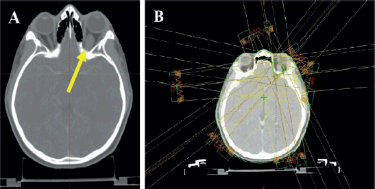 Figure 3. Planning CT scan images of the patient. (a): Arrow shows hypodense fusiform enlargement of the left optic nerve. (b): Contours and isodose coverage of the PTV and beam arrangements.