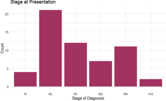 Clinical distribution can be seen in Table 2, which indicates that 56.2% of cases were diagnosed at an advanced stage (stages IIB and IV), Figure 1. Additionally, anaemia (PCV <30%) was present in 75.4% of women. Postcoital bleeding was reported in 35.1% of cases. Most participants (73.7%) were postmenopausal at the time of diagnosis.
