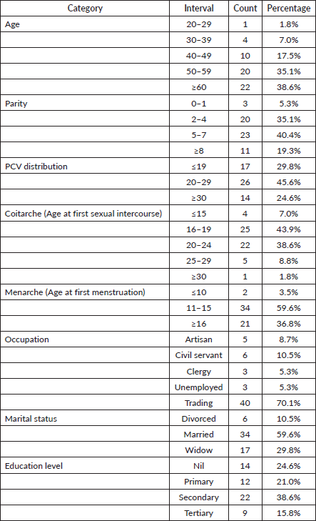 Table 1 revealed that 73.7% of participants were 50 years or older, and a significant proportion (40.4%) had between 5 and 7 children. The most common age at first sexual intercourse was between 16 and 19 years, accounting for 43.9% of cases. Additionally, 59.6% of participants had their first menstruation between the ages of 11 and 15 years. The majority of women were traders (70.1%), while artisans, civil servants, clergy, unemployed individuals and teachers each represented less than 10% of the cohort. Marital status analysis showed that nearly 60% of participants were married at the time of diagnosis. Regarding education levels, 24.6% had no formal education, 21.0% completed primary education, 38.6% attained secondary education and 15.8% had tertiary education.