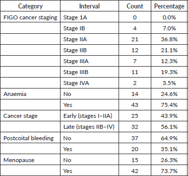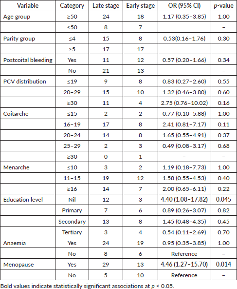Results: Of the 102 women who presented during the study period, only 57 (55.9%) had complete staging, clinical and demographic data; these complete cases were included to ensure data integrity. From this population, 73.7% were aged 50 years or older and 56.1% presented with late-stage disease. Additionally, anaemia (packed cell volume <30%) was present in 75.4% of women. Postcoital bleeding was reported in 35.1% of cases. Women with no formal education had higher odds of late-stage diagnosis odds ratios (OR: 4.40, 95% CI: 1.08–17.82). Postmenopausal women also had higher odds of late-stage diagnosis (OR: 4.46, 95% CI: 1.27–15.70).