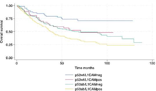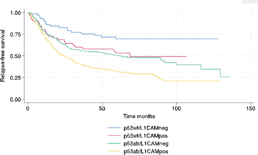 In conclusion, in this high-risk histology cohort, patients with L1CAM positive had a worse prognosis similar to p53-aberrant tumours, and the combination of p53ab/L1CAMpos showed an even higher risk of progression and death compared to p53wt/L1CAMneg. This finding should be confirmed in other cohorts.