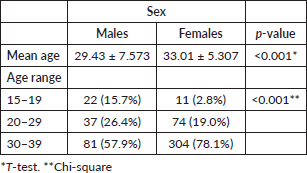 Among the AYAs, almost three-quarters (73.5%) were females, giving a male-to-female ratio (M:F) of 1:3. A large majority of them (72.8%) were within the age group 30–39 years (Figures 2 and 3), while their mean age was 32.06 ± 6.18 years. There was a statistically significant difference between the mean ages of males (29.43 ± 7.57 years) and females (33.01 ± 5.31 years) with p < 0.001 and there was a statistically significant association between age group and sex as the proportion of males within the age group 15–19 years (15.7%) was higher than that of the females (2.8%) and the proportion of females within the age group 30–39 years (78.1%) was higher than the proportion for males (57.9%) with p < 0.001 (Table 1).