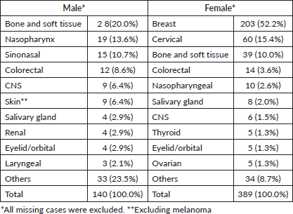 Results: There were 529 new cancer cases among AYAs, accounting for 14.1% of all cancer cases seen during the period. The male-to-female ratio was 1:3. The majority (72.8%) were in the 30–39 age range, with a mean age of 32.06 ± 6.18 years. Females had a higher mean age (33.01 ± 5.31 years) than males (29.43 ± 7.57 years) (p < 0.001). Breast (39.1%), bone and soft tissue (12.9%) and cervix (11.6%) were the most common sites of cancer in AYAs. Among the males, bone and soft tissue (20.0%), nasopharynx (13.6%) and sinonasal (10.7%) were the most common sites, while breast (52.2%), cervix (15.4%) and bone and soft tissue (10.0%) were the most common sites among females.