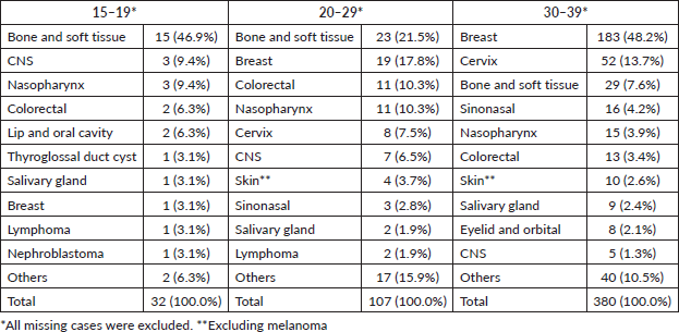 This study showed that breast cancer was the most common malignancy in AYAs, followed by bone and soft tissue cancers, cervical cancer and nasopharyngeal cancer. In Europe and the USA, breast cancer, thyroid cancer, testicular cancer and skin melanoma were the most common cancers seen in AYAs [5, 6], while breast cancer, thyroid cancer, astrocytoma and gastric cancer were the most common cancers in AYAs in India [8]. The second to fourth most common cancers in our study differed from the reports from Europe, the USA and India, and this could be due to different genetic, sociodemographic, environmental, lifestyle and health care system factors, which should be evaluated. This is supported by findings reported by Li et al [13] who demonstrated that breast cancer and thyroid cancer were the most common AYA cancers in very high and high Human Development Index (HDI) countries, while breast cancer and cervical cancer were the most common AYA cancers in medium and low HDI countries. This is not unexpected, as medium to low HDI countries have been associated with a high burden of poverty and infection-related cancers [15]. Global cancer statistics for AYAs revealed that breast cancer, thyroid cancer and cervical cancer were the most commonly diagnosed cancers in AYAs [13]. This reflects a combined picture of the most common cancers in AYAs in high, medium and low HDI countries. The distribution of AYA cancers differed based on sex in our study. Bone and soft tissue cancers (20.0%), nasopharyngeal cancer (13.6%) and sinonasal cancer (10.7%) were the most common AYA cancers among males, while breast cancer (52.2%), cervical cancer (15.4%) and bone and soft tissue cancers (10.0%) were the most common among females. A Nigerian study by Ntekim et al [16] also demonstrated similar findings among female AYAs with cancer. They reported breast cancer (49.75%) and cervical cancer (7.33%) to be the most common malignancies among female AYAs [16]. AYA cancers also differed based on sex in a study done in USA which reported breast cancer (22.8%), thyroid cancer (21.7%) and melanoma (9.5%) as the most common cancers among female AYAs and testicular cancer (20.0%), lymphoma (15.6%) and melanoma (8.4%) as the most common cancers among male AYAs [17]. The incidence rates of thyroid cancer, lymphoma and melanoma were higher in the USA study compared to our study. This could be due to the lower incidence of these malignancies in the Nigerian population [12]. The burden of these malignancies could also be underestimated due to limited access to appropriate diagnostic facilities (such as thyroid ultrasound scan) and a trained technical workforce. It could also be because patients with thyroid cancer and lymphoma usually present to the surgical oncologist and haemato-oncologist, respectively, in our setting, hence their under-representation in our study. AYA cancers also varied across age groups in our study. Bone and soft tissue cancers, CNS tumours and nasopharyngeal cancers were the most common among AYAs between 15 and 19 years. Bone and soft tissue cancers, breast cancer and colorectal cancer were the most common among AYAs 20–29 years, while breast cancer, cervical cancer and bone and soft tissue cancers were the most common among AYAs 30–39 years. Miller et al [4] also revealed differences in AYA cancers across age groups. They reported thyroid cancer, Hodgkin’s lymphoma and CNS tumours as the most frequent cancers among AYAs within 15–19 years, thyroid cancer, testicular cancer and germ cell tumours as the most frequent cancers among AYA within 20–29 years and breast cancer, thyroid cancer and melanoma as the most frequent cancers among AYA within 30–39 years [4]. Li et al [13] demonstrated that leukaemia and thyroid cancer were the most prevalent cancers in adolescents, and breast and thyroid cancer were the most common among individuals in the 20–39 age range.