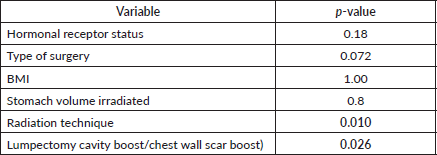In the univariate analysis, (Table 3) several variables were assessed for their association with acute upper GI toxicity. No statistically significant relationship was found between acute upper GI toxicity and hormonal receptor status (p = 0.18), type of surgery (p = 0.072), BMI (p = 1.00) or stomach volume (p = 0.8) (Figure 2). However, the radiation technique was significantly associated with the development of acute upper GI toxicity (p = 0.010) and higher RT dose delivered (boost) was significantly associated with acute upper GI toxicity (p = 0.026). Moreover, a strong positive correlation was observed between higher fractionated dose delivered to D10 cc (p = 0.0001), D30 cc (p = 0.0001) and D60 cc (p = 0.0001) of stomach and acute upper GI toxicity, indicating that increased stomach dose exposure is associated with higher toxicity risk.