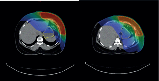 These findings reinforce the protective role of DIBH, which minimises dose exposure to the stomach by reducing motion-related variability and improving treatment reproducibility due to physiological changes occurring during DIBH technique leading to expansion in lung volumes and displacement of diaphragm in downward direction leading to lower iso dose curves on stomach, hence reduced toxicity.