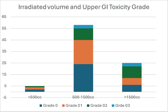 A crosstabulation analysis was performed to explore the association between volume irradiated and upper GI toxicity grade. Irradiated volumes were categorised into three subgroups: <500 cc, 500–1,500 cc and >1,500 cc. Among patients with Grade 1 toxicity, 65.5% belonged to the 500–1,500 cc group, while 27.6% and 6.9% were in the >1,500 and <500 cc groups, respectively. For patients with Grade 2 toxicity, the majority (87.9%) had 500–1,500 cc of volume irradiated, whereas 9.1% were in the >1,500 cc group and 3.0% in the <500 cc group. Among patients with Grade 3 toxicity, 60% were in the 500–1,500 cc group and 40% in the >1,500 cc group, with no cases observed in the <500 cc group. Overall, higher grades of GI toxicity (Grades 2 and 3) were more frequently seen in patients with larger irradiated volumes (>1,500 cc) compared to those with smaller volumes, suggesting a potential link between increased radiation volume and a higher risk of upper GI toxicity (Supplementary Figure 4).