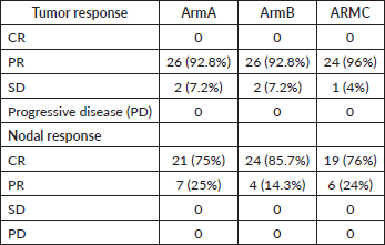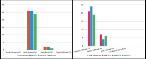 An objective locoregional response evaluation was conducted on the day when the therapy was finished. None of the patient had a complete tumour response in any of the arm. 92.8%, 92.8%, 96% patients in Arm A–C, respectively, had partial tumour response. 7.2%, 7.2% and 4% patients in Arm A–C, respectively, had stable disease (SD). None of the patients in any of the arms developed progressing disease. 75%, 85.7%, 76% patients had complete nodal response in Arm A–C, respectively, while 25%, 14.3% and 24% had partial nodal response. Complete nodal response was seen maximum in Arm B. For tumour response, both ARM A and B were equivalent as depicted in Table 3. The patients were followed for a minimum period of 6 months (range 6–21 months) or until death. 9 patients lost to follow up in Arm A, 8 in Arm B and 10 in Arm C at variable lengths of time.